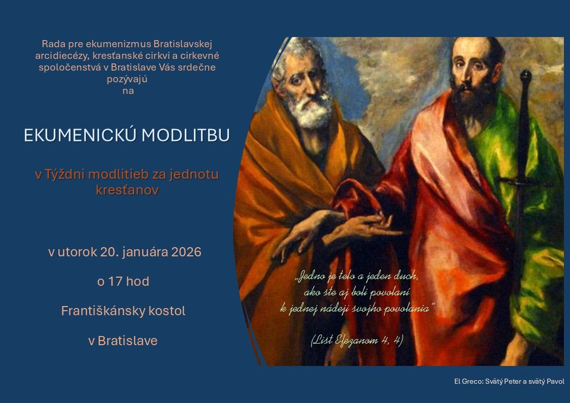 V utorok 20. januára 2026 sa bude opäť konať ekumenická modlitba za jednotu kresťanov medzi duchovnými a veriacimi väčšiny cirkví, ktoré pôsobia v Bratislave. Účasť potvrdili duchovní z Rímskokatolíckej cirkvi, Gréckokatolíckej cirkvi, Reformovanej kresťanskej cirkvi, Cirkvi bratskej, Evanjelickej cirkvi augsburského vyznania a Bratskej jednoty baptistov. Zastúpená bude aj Slovenská evanjelická aliancia a Ekumenický výbor Evanjelickej cirkvi augsburského vyznania na Slovensku. Viacerí duchovní sa aj krátko prihovoria k biblickým textom, ktoré v tomto roku pripravila spoločná komisia cirkví v Arménsku a ktorej predsedala Arménska apoštolská cirkev. Aj tento rok bude celú modlitbu prenášať Rádio Mária. Táto ekumenická modlitba má už dlhoročnú tradíciu a mnohí sa tešia na toto tradičné stretnutie vzájomnej lásky s Ježišom prítomnými medzi všetkými kresťanmi.