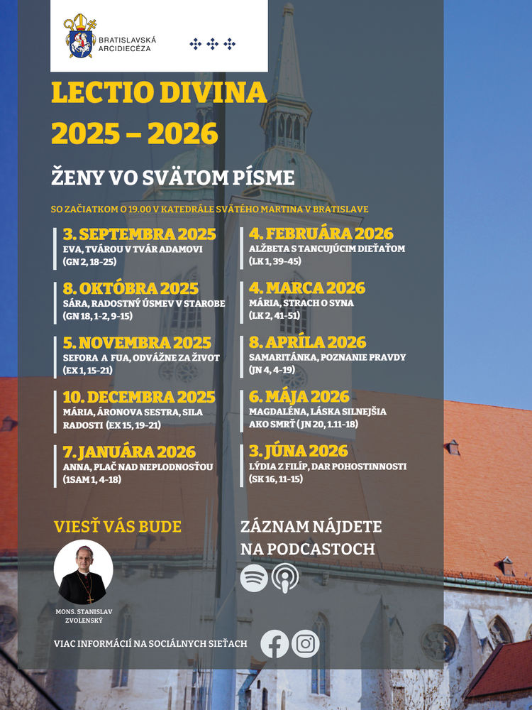 Bratislavský arcibiskup metropolita Mons. Stanislav Zvolenský vedie ďalší ročník modlitbových stretnutí nad Svätým písmom formou Lectio divina pod názvom Ženy vo Svätom Písme. Bibické texty, venované biblickým ženám, sú základom pre desať modlitbových stretnutí, ktoré sa konajú v Katedrále sv. Martina od septembra 2025 do júna 2026 prevažne v prvú stredu v mesiaci o 19.00.